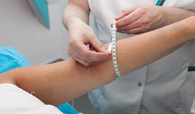 Met een bio-impedantiemeting wordt de aanwezige hoeveelheid water in uw lichaam gemeten. Ook kunnen we meten hoeveel water er in uw arm of been met lymfoedeem zit.